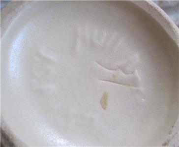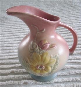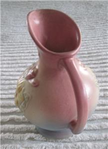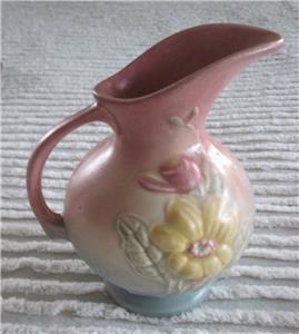 This auction is for a Hull Art Pottery Magnolia Matte pitcher #5 in excellent condition, four pin point size glaze pops noted in the glaze under the spout shown below. It is 7" high and 5" in diameter.