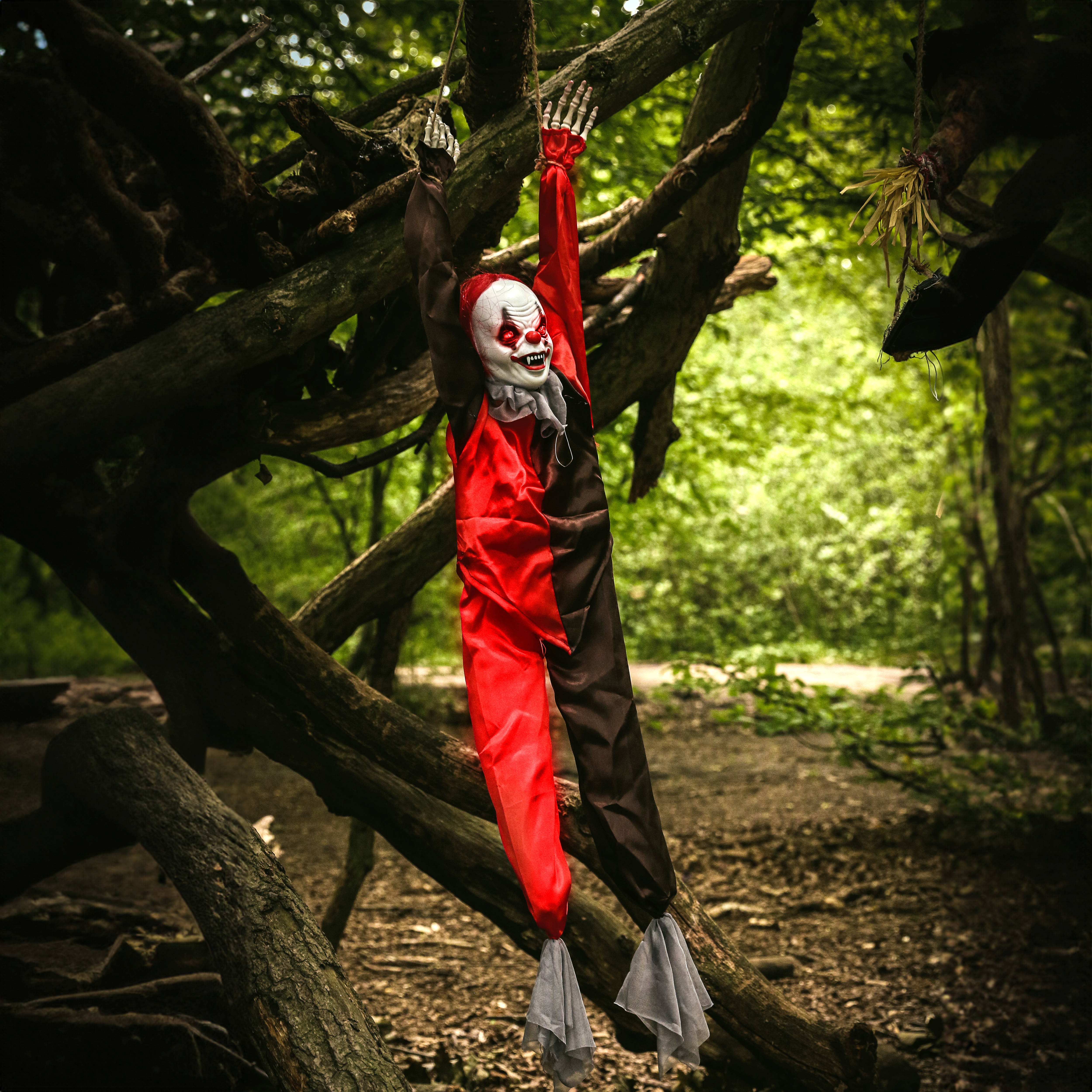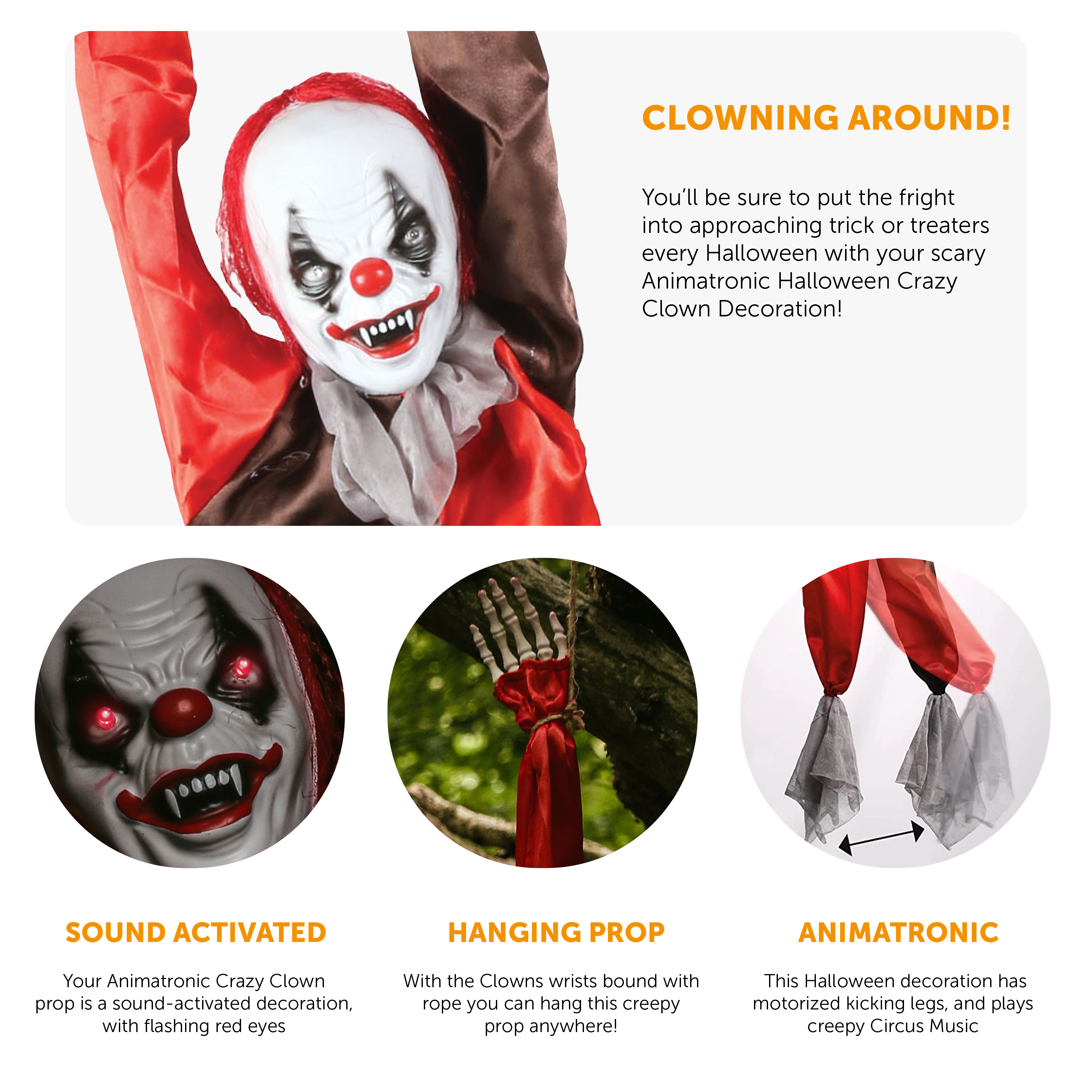 HANGING CLOWN DECORATION FEATURES: Your Hanging Killer Clown animatronic is a sound-activated decoration, with flashing red eyes, motorized kicking legs, and plays creepy Circus Music to unease your visitors! Included with 3AA Batteries!