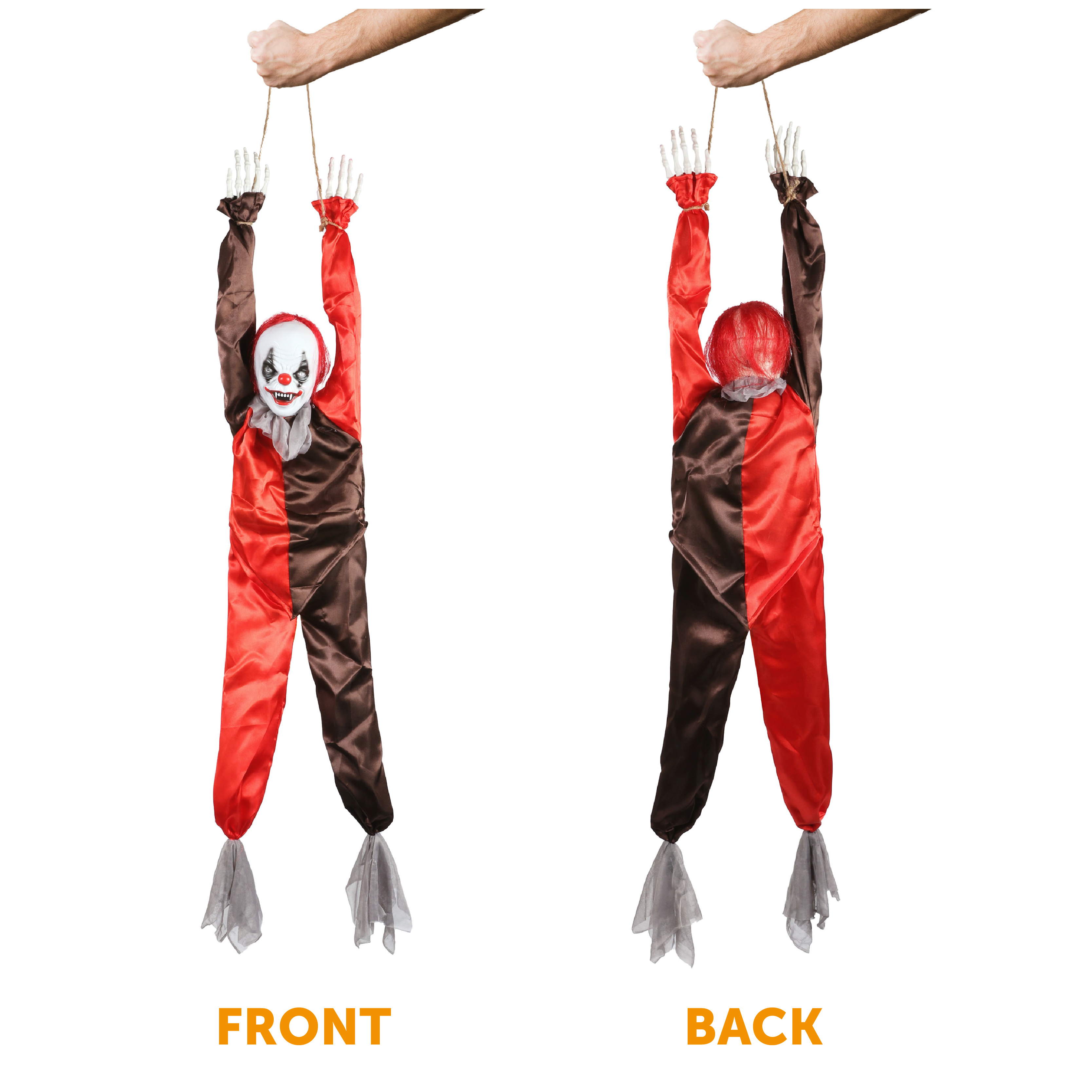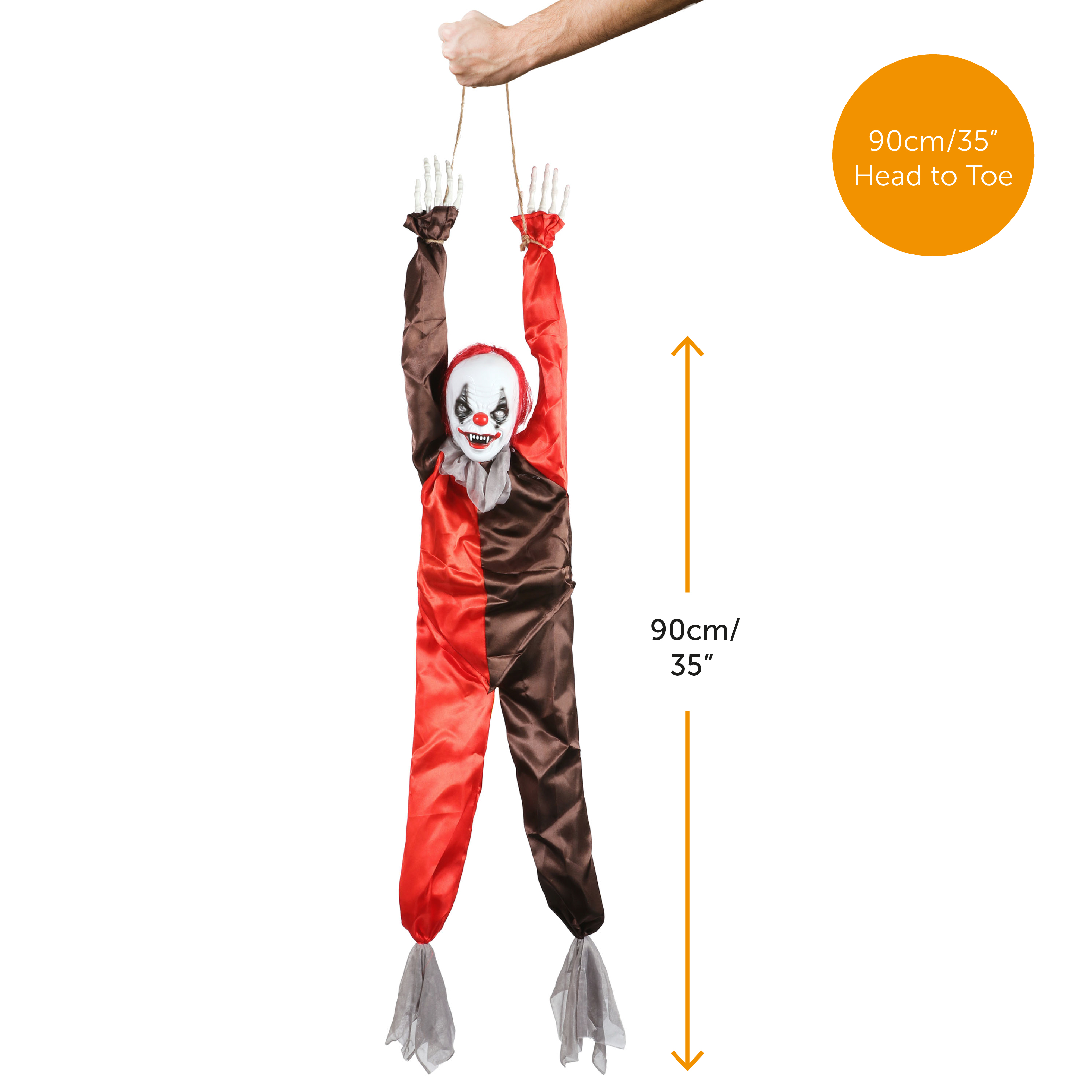 ANIMATRONIC CLOWN MEASUREMENTS: Your Crazy Hanging Clown Animatronic is 90cm/35” tall from the head down, a large and very noticeable Killer Clown decoration that will be sure to stand out proudly for your home and event decoration!