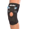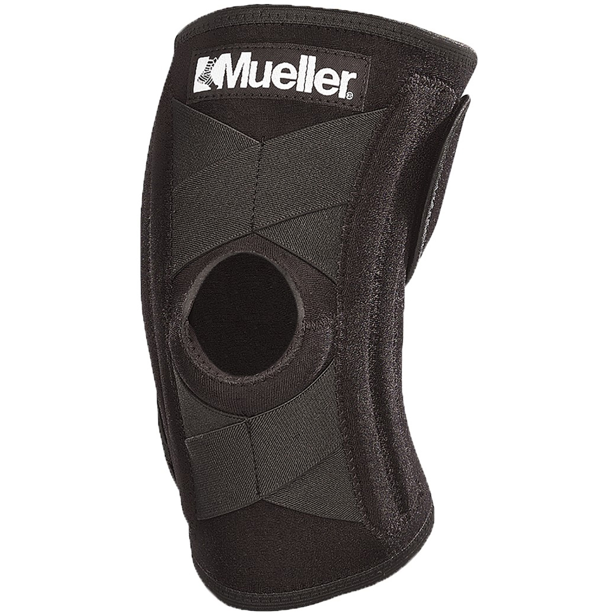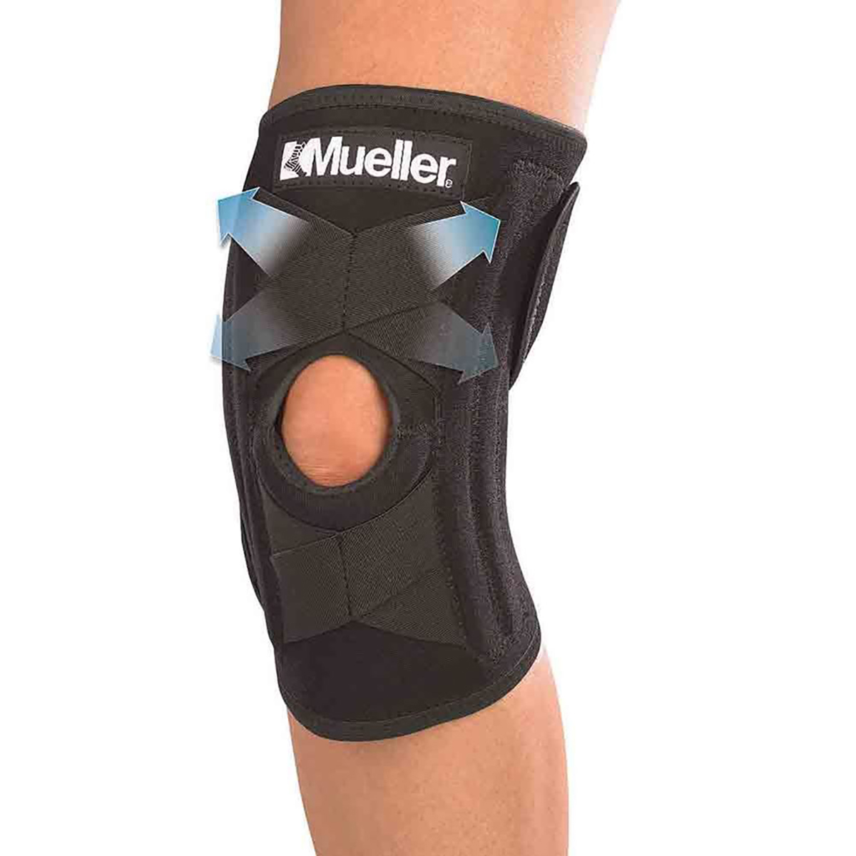 The Mueller Self-Adjusting Knee Stabilizer features criss-cross straps for consistent support above and below the patella.