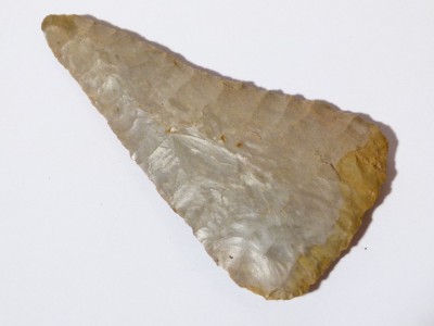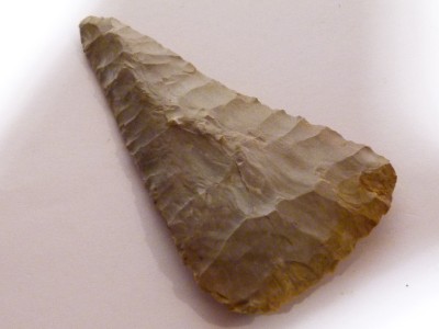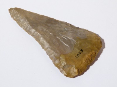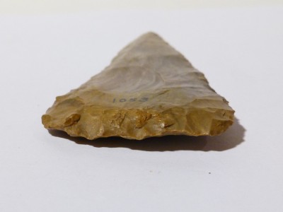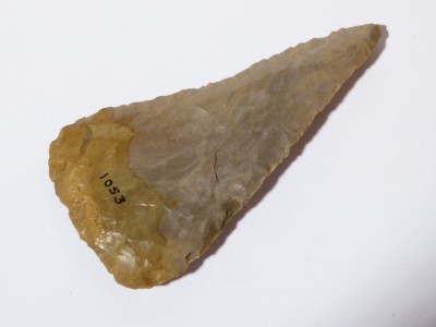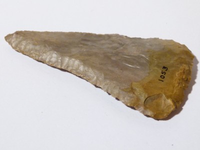 This one is a darkish greay on one side and a light grey with an orangy tinge colour ...numbered 1053 in black .....I like the shape of this one...its a sort of TRIANGULAR shape.. ..nice secondry working all over on all the edges.. one side may have been re-worked as its slightly concave .. and a differant shape to the other side.. its an absolute BELTA of a flint... ..it is approx 3 and 3/4 inch long x 2 inch bottom .