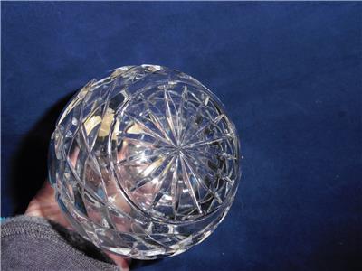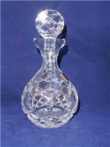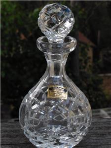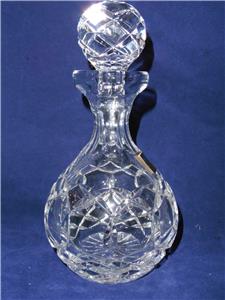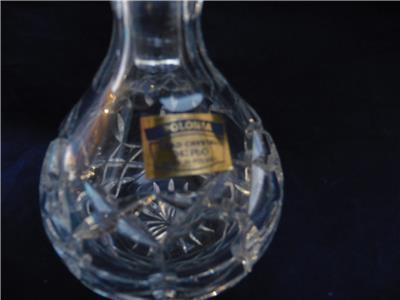 The is a very nice cruet set by POLONIA lead crystal, made in Poland. The round one measures 7.25" high, to top of stopper, 5.5" high without stopper, 3.75" wide, the other is 7" high to top of stopper, 4.75" without stopper, 4.25" across bottom. Excellent condition, no chips or damage.