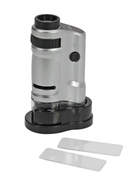 Praktisches Zoom-Mikroskop für vielfältige Einsatzmöglichkeiten. Hervorragende Bildschärfe und Auflösung, stufenlose Einstellung zwischen 20 und 40-facher Vergrößerung. LED Beleuchtung sorgt für eine optimale Ausleuchtung des Betrachtungsgegenstandes. Inklusive Objektträger und Batterien (3x LR44). Abmessungen ca.: 10 x 5,5 x 3 cm
