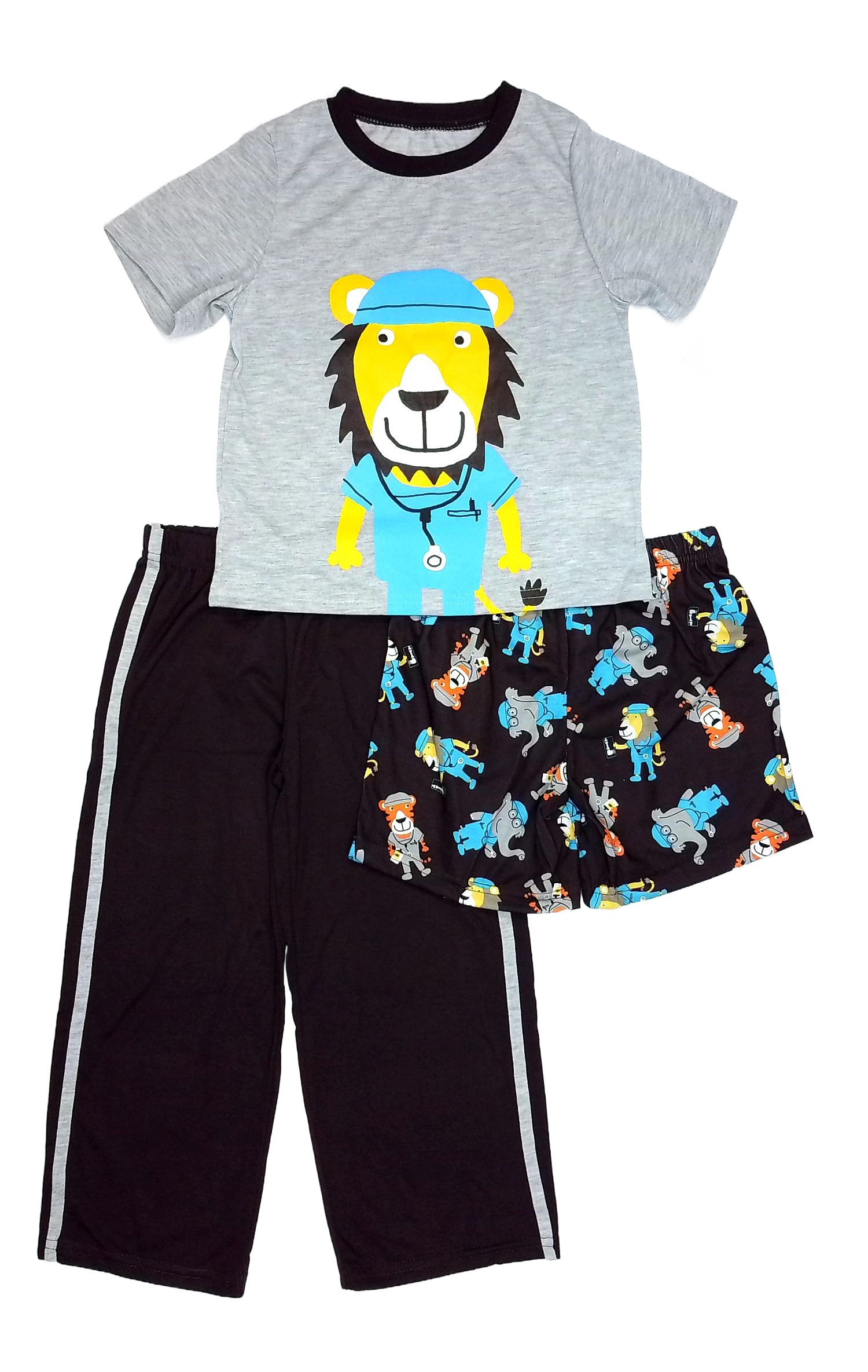 A comfy 3-piece set with a super cute Animal doctor theme. Gray short-sleeved tee pajama top with brown trim and lion doctor applique. Solid brown pajama shorts. Colorful print pajama pants with full elastic waistbands.