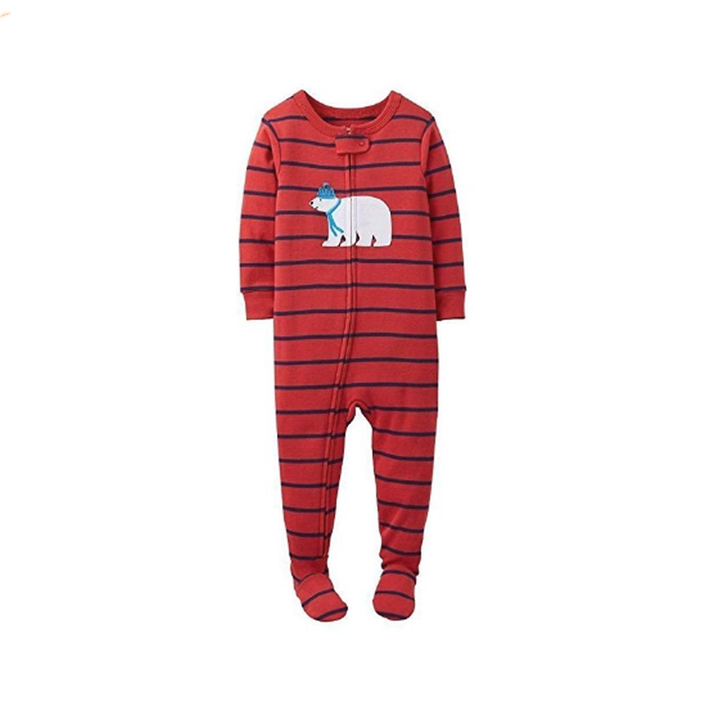 He'll stay warm and cozy this winter season in this Carter's blanket sleeper. Red with stripes of navy blue. A super cute Polar bear in soft fabric and embroidery. A full front zipper and zipper cover tab. Non-slip, textured foot soles. Of an ultra-soft and plush fleece, inside and out.