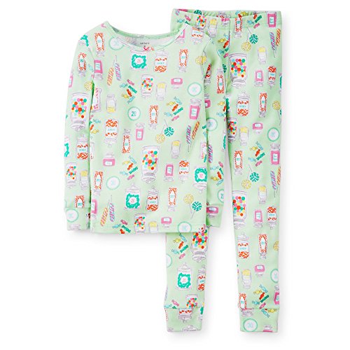 This adorable pajama set includes a long-sleeve top and long bottoms. It features a mint green color with a colorful all-over candy print. The cotton rib fabric is cool and comfortable, featuring a no-pinch elastic waistband and ribbed cuffs on both the top and bottoms.