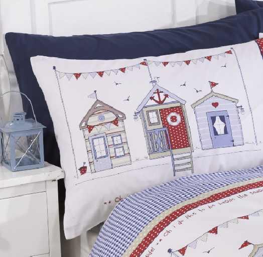If you like to be beside the seaside, you'll love these beach hut duvet cover bed sets! The design features a neat blue and white checked design with strips of red and beige dotted with white polka dots. Also featured is a clean white panel overlaid by beautiful softly coloured white, beige, lilac, blue beach huts connected by strings of bunting captioned with the text 'Oh I do like to be beside the seaside' in red font. The reverse of the bedding has a stylish red, beige, white, and blue striped design which goes perfectly with the beach theme.