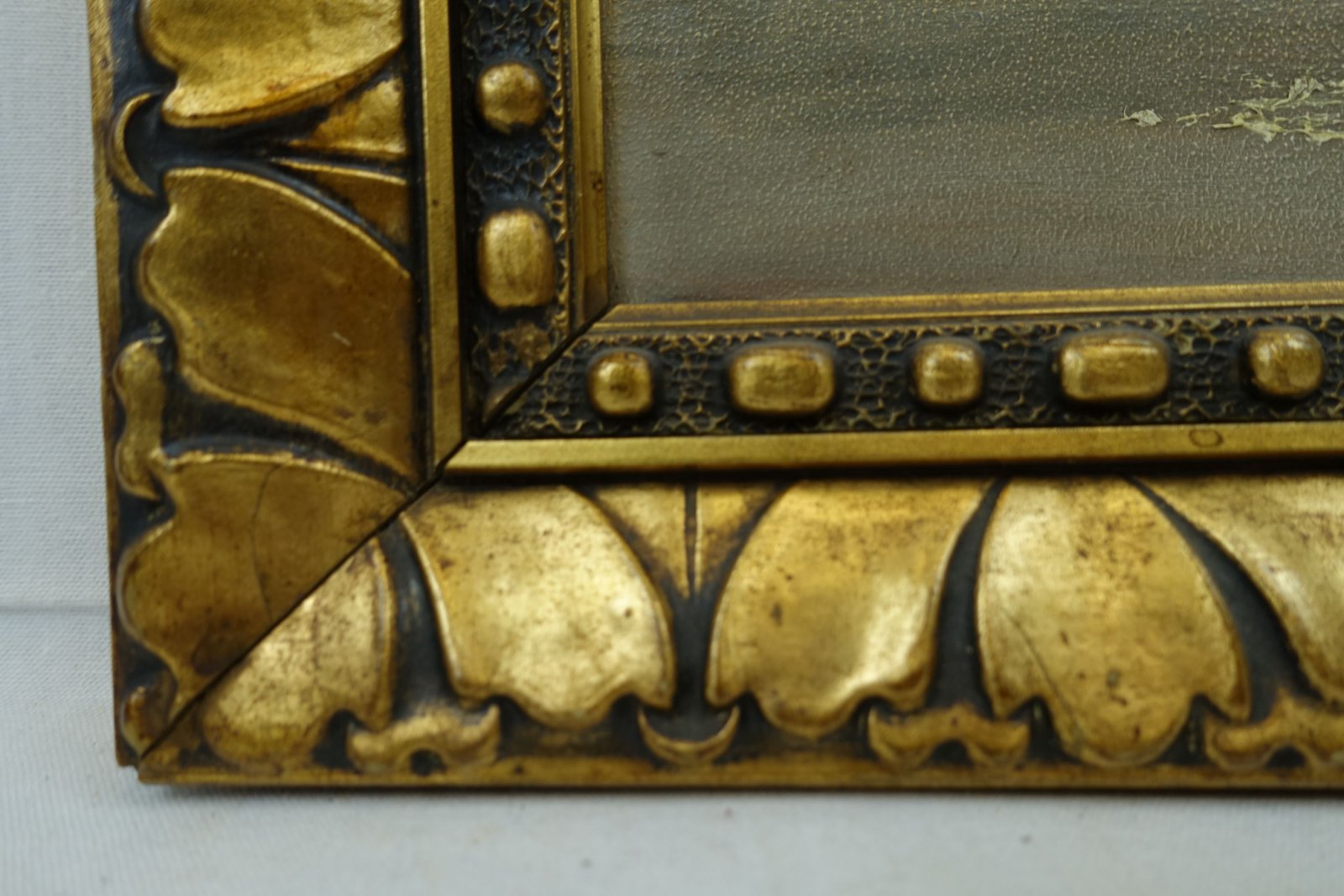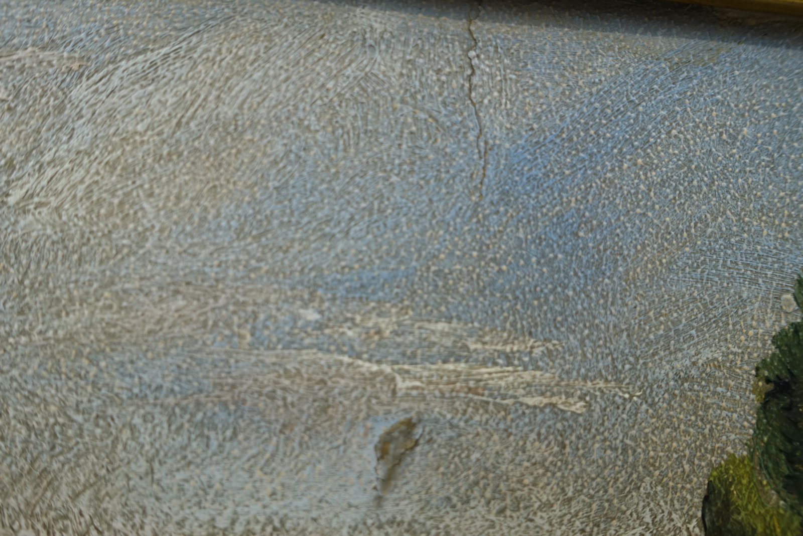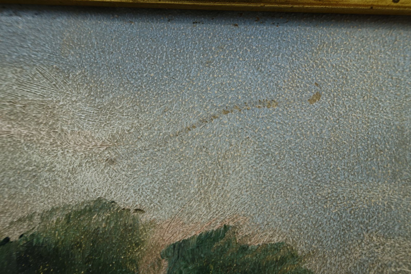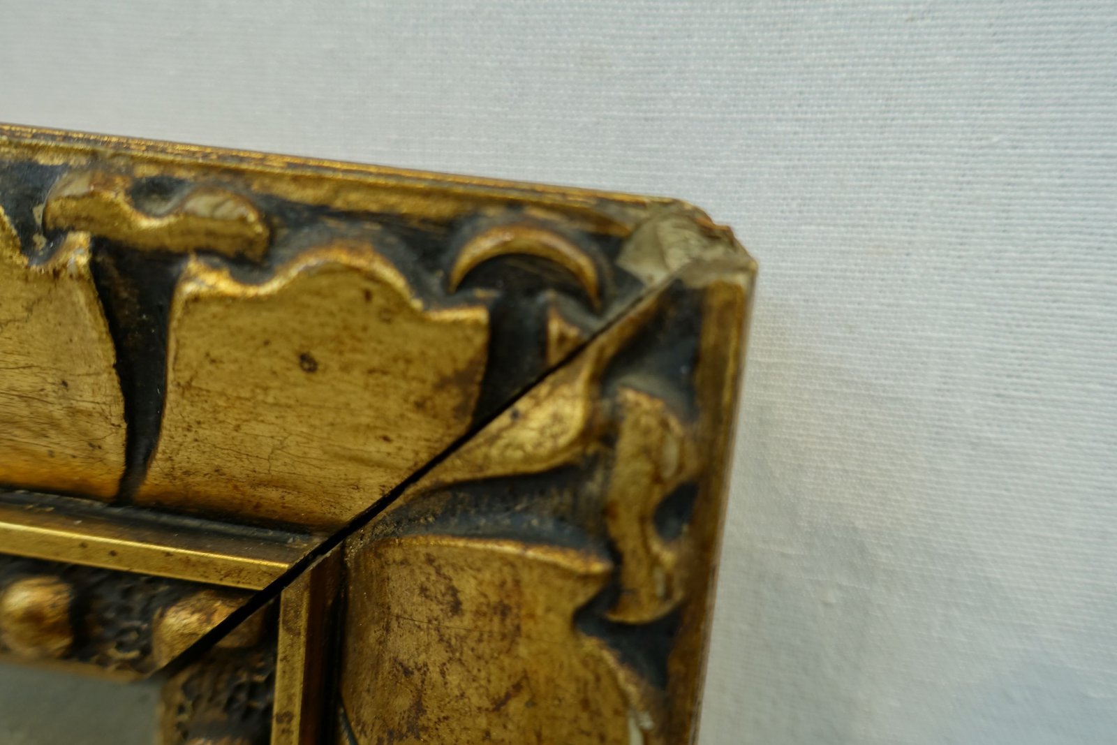 Das Gemälde weist Kratzer und Oberflächenverschutzung auf.