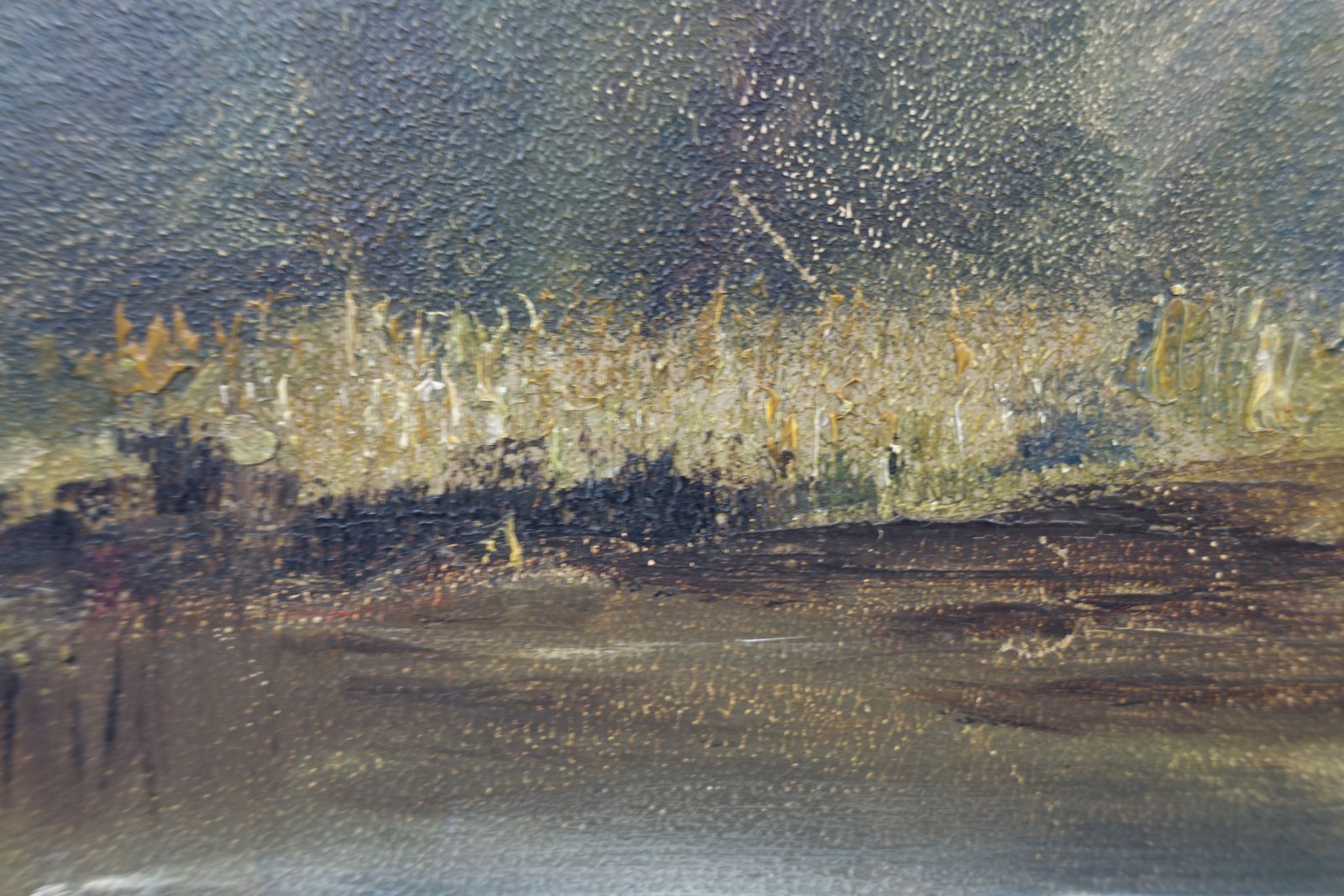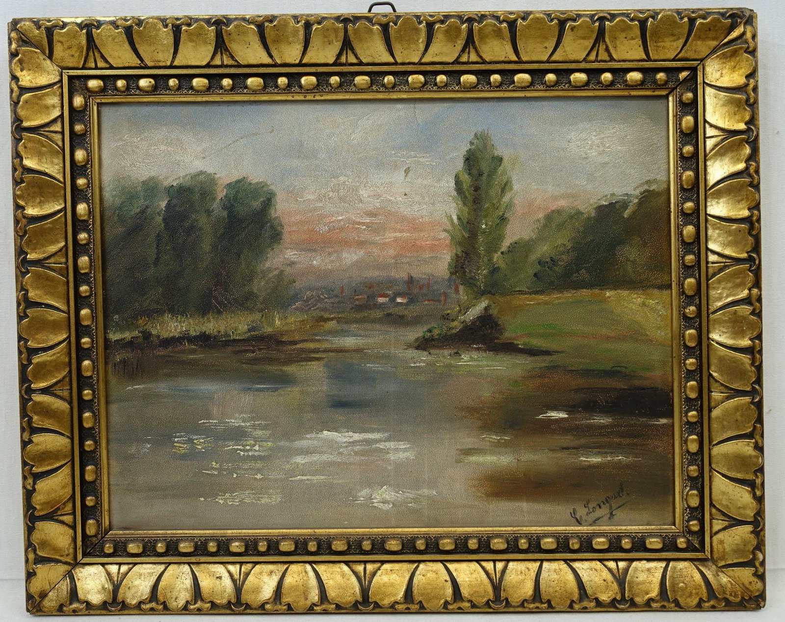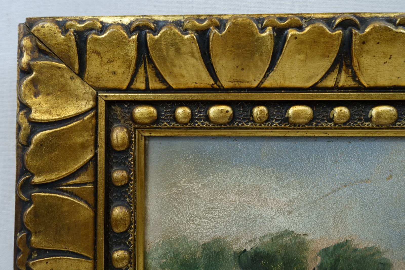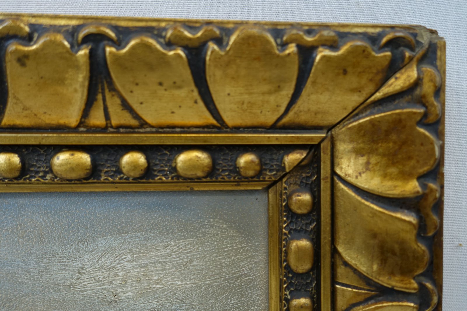 Das Gemälde weist Kratzer und Oberflächenverschutzung auf.
