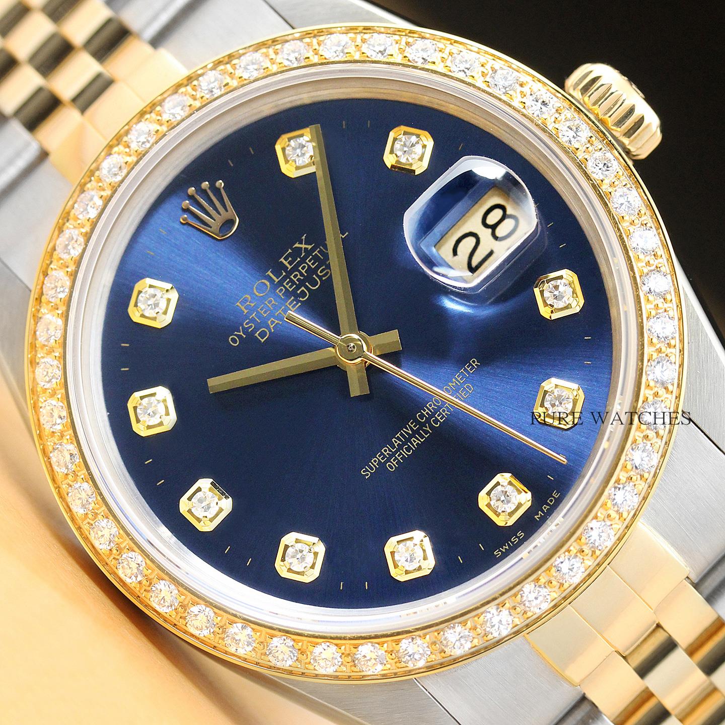 This is an authentic Rolex Datejust 16013 watch with Rolex 18K yellow gold and stainless steel jubilee bracelet, Rolex dial Ref. with added genuine diamond markers, and custom 18K yellow gold diamond bezel.