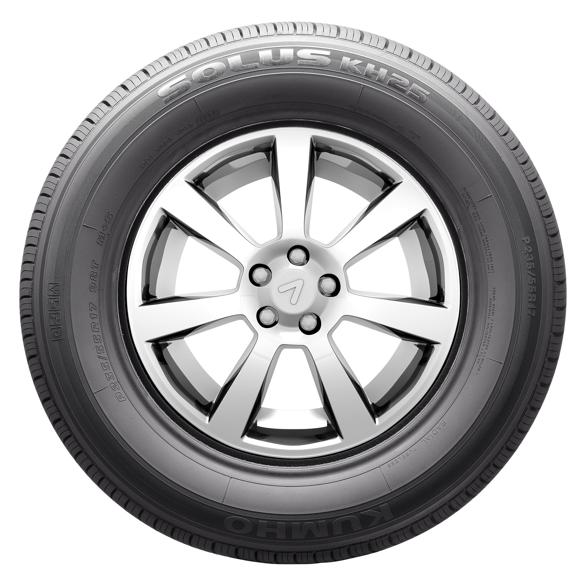 The Solus KH25 from Kumho is an all-season, high-performance tire that's designed for use on sporty sedans and mid-level family vehicles, and offers drivers strong traction, quick steering response, and a comfortable ride. The Solus KH25's full depth circumferential and variable pitch lateral grooves force water out of tread to reduce the risk of hydroplaning on slippery roads, and the tire also features a silica-enriched tread compound that allows for consistent performance year-round.
