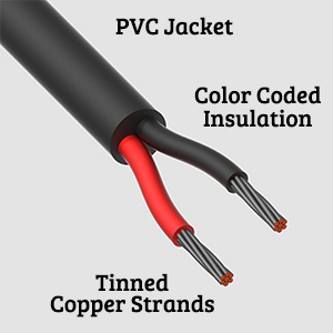 Cable length has been printed and remaining length is indicated directly on the cable(see photo). The inner conductor jackets are color coded red and black to maintain proper polarity throughout your installation. The cable is finished in a black ultra-flex PVC jacket.