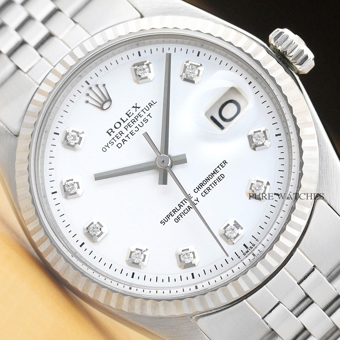This is an authentic Rolex Datejust 1601 watch with stainless steel folded jubilee bracelet, Rolex dial Ref. with added genuine diamond markers, and Rolex 18K white gold fluted bezel.
