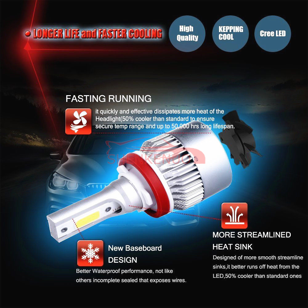 HIGH POWER: Each bulb equipped with 2 pieces premium quality Large COB LED chips with 60W per pair for 360 degree super bright illumination. The Built-In Fan design allows IC chip to give out stable high lighting output constantly (6000 Lumen/set). High optical density, and enhance light efficiency up to 98%.