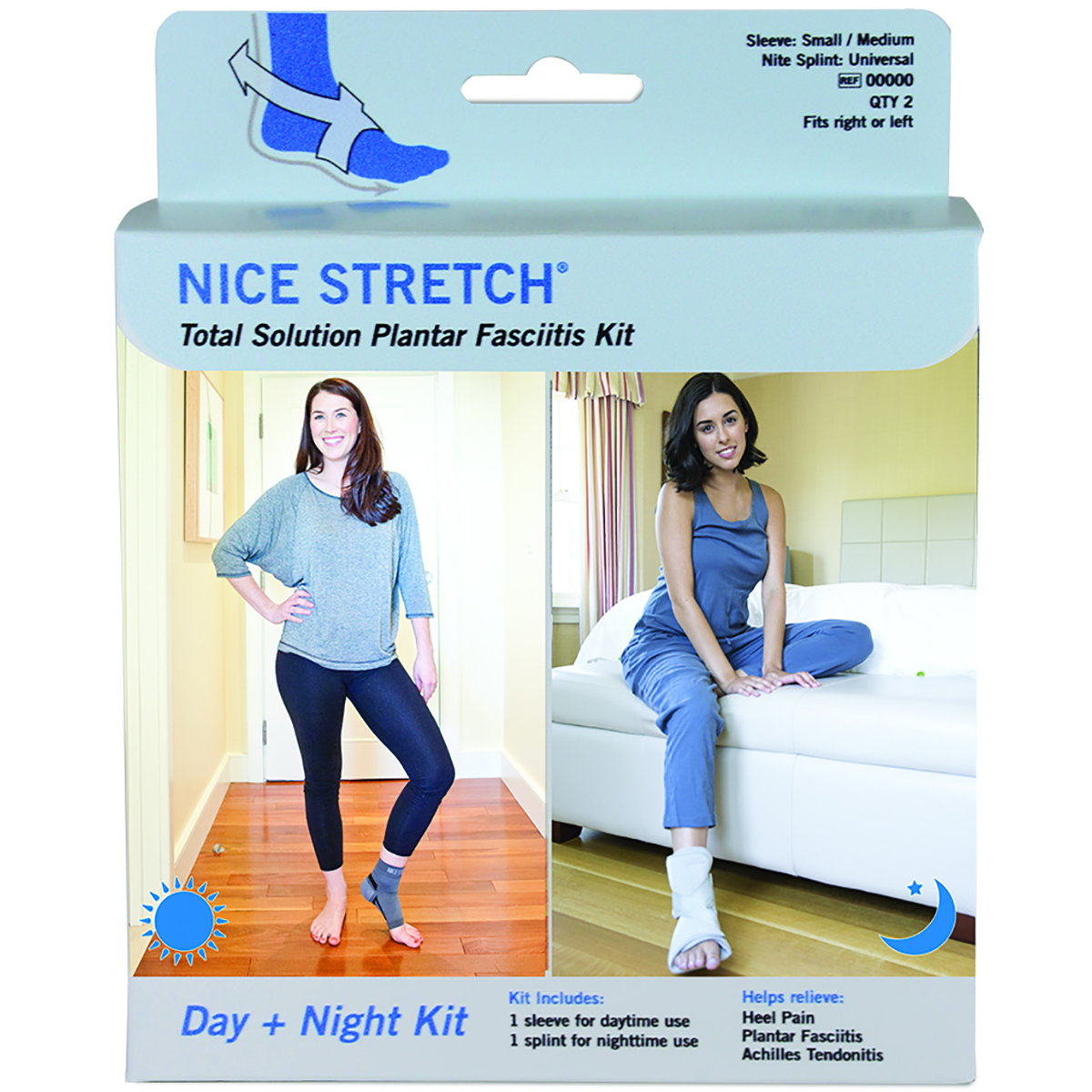 The Nice Stretch Total Solution Plantar Fasciitis Relief Kit provides 24-hour support and pain relief for your ankle, arch and heel. It provides "round-the-clock" treatment for your Plantar Fasciitis pain. This kit includes one sleeve for daytime use and one splint for nighttime use.