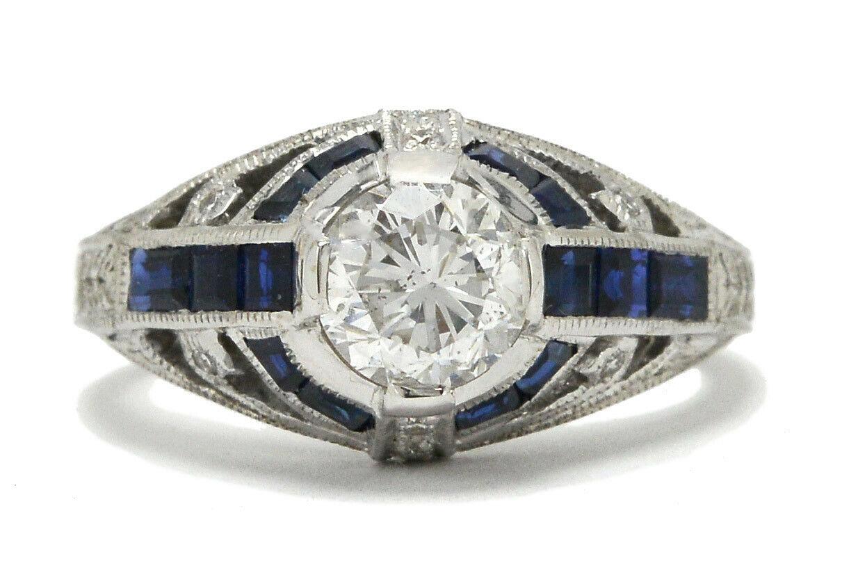 An intriguing revivalist Art Deco diamond engagement ring. A blazing, brilliant 1.02 carat solitaire sits regally in a sapphire kissed stepped pyramid dome. You will adore the old world milgrain and engraved band details. Judged as H, near colorless. Expertly hand fabricated in 18kt white gold, a faithful emulation of a 1920s classic, using the same tools and techniques from 100 years ago. The workmanship rivals Cartier, Tiffany, Van Cleef & Arpels.