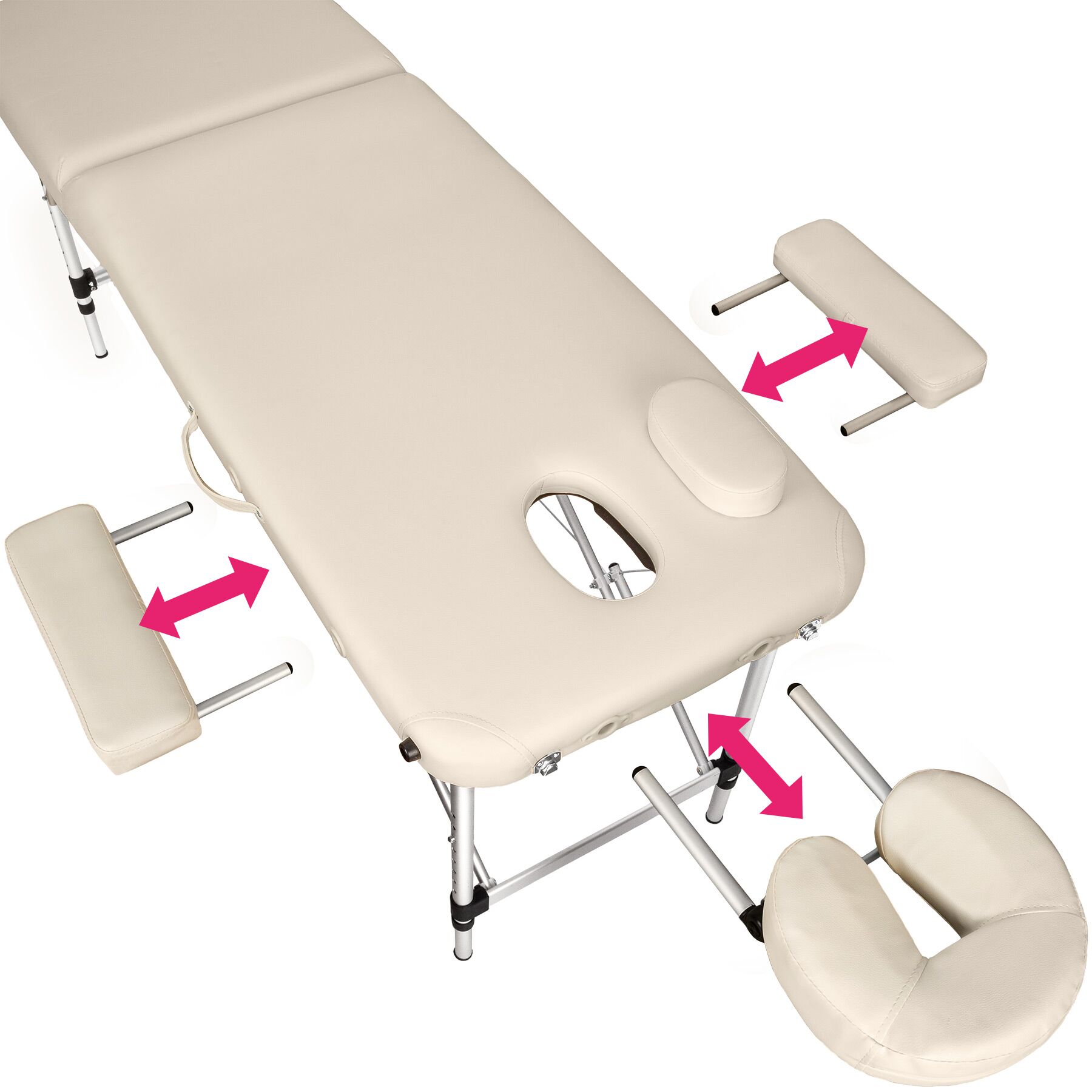 Die ansteckbaren Armstützen bieten zusätzlichen Komfort, egal in welcher Körperhaltung. In der Bauchlage ist das herausnehmbare Gesichtspolster optimal, während die ansteckbare Kopfstütze auch in der Rückenlage für beste Unterstützung sorgt. So kannst du jede Massage in vollen Zügen genießen.
