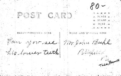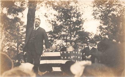 Very attractive and historic real photo postcard showing a view of President Teddy Roosevelt. The message on reverse asks, "Can you see his lower teeth." The answer is yes and clearly so under magnification. Was the writer asking with regards to the clarity of the photograph he may have taken or was something else being suggested? Roosevelt did have two front dentures and is also reported to have 'squirrel' teeth. Dental / Dentist / Dentistry related.