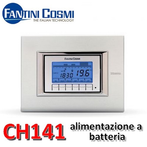 CRONOTERMOSTATO SETTIMANALE da INCASSO - COVER INTERCAMBIABILI FANTINI COSMI CH141A ALIMENTAZIONE A BATTERIA Cronotermostato elettronico a microprocessore, con programmazione settimanale per il comando di impianti di riscaldamento e di condizionamento. Il kit comprende: 3 COVER COLORATE bianco, silver, antracite 3 COVER SPECIALI per BTicino Axolute e Ave Sistema 44 bianco, silver, antracite 3 COPPIE DI ADATTATORI COLORATI bianco, silver, antracite 1 COPPIA DI ADATTATORI per BTicino Matix bianco 2 TELAI per offrire compatibilità con le più diffuse placche Placche non comprese Codice prodotto: CH141A