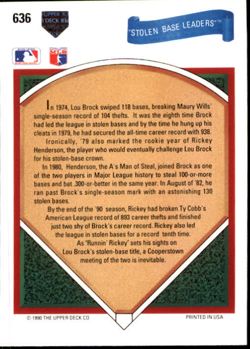 1991 Upper Deck #636 Rickey Henderson SB Lou Brock May 1 1991 date on front