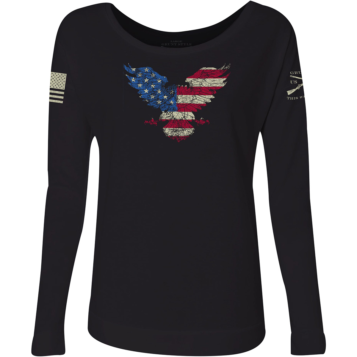 Stay nice and comfy in the Grunt Style Women's Freagle French Terry Scoop Neck Long Sleeve T-Shirt. It's crafted from 50% combed ring-spun cotton and 50% polyester for soft, all-day comfort and wear. It features a tagless, itch-free design and ribbed collar that won't lose its shape. It also has double-needle stitching for durability. There's no better way to show your American pride than sporting your favorite shirt from Grunt Style.