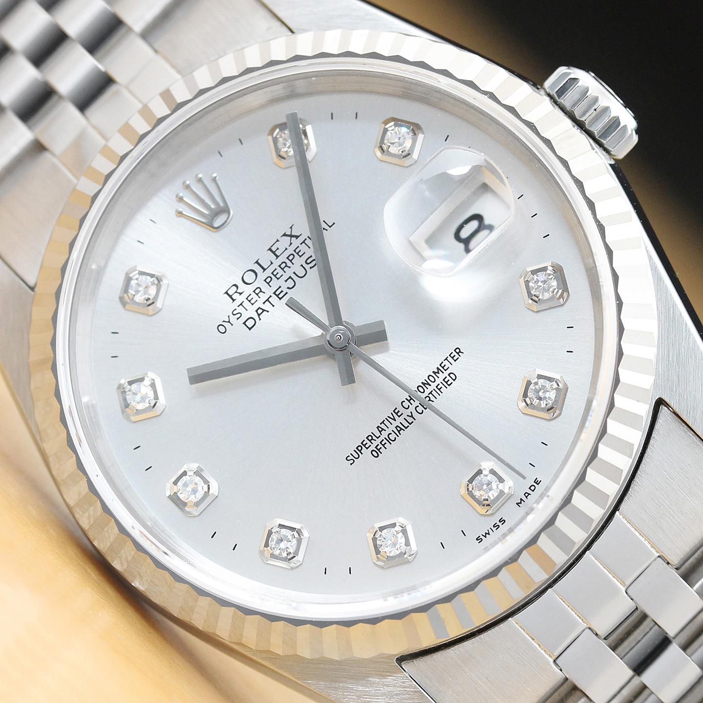 This is an authentic Rolex Datejust 16234 watch with Rolex stainless steel jubilee bracelet, factory Rolex diamond dial Ref., and Rolex 18k white gold fluted bezel.
