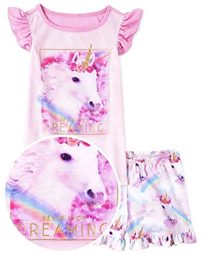 Your Unicorn fan will love the sweet and colorful graphics along with the comfort of the soft polyester jersey fabric. Features a Unicorn adorning a floral head wreath with a rainbow and star themed background. A roomy rib-knit collar in pink and pink flutter sleeves that add to the charm. Coordinating print pajama shorts with an elasticized waistband for a custom fit.