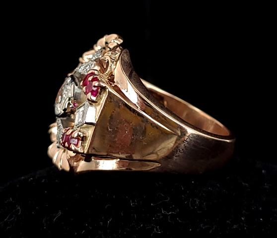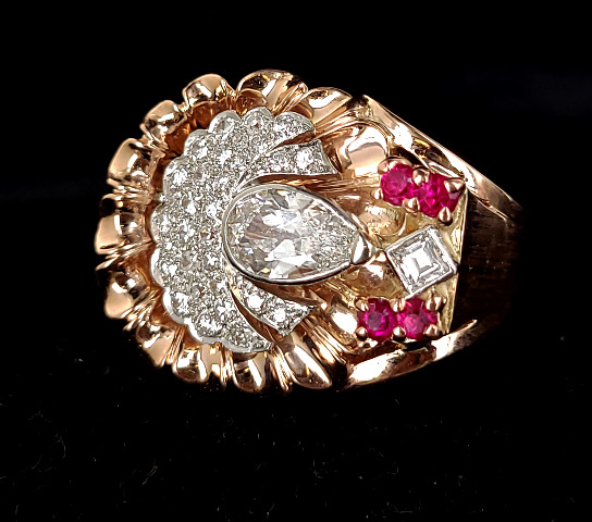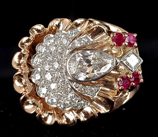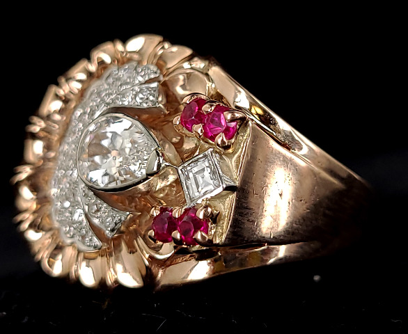 Antique Art Deco 14k Rose Gold 2.6cttw F VS1 Diamond Ruby Open Cullet Ring sz 8