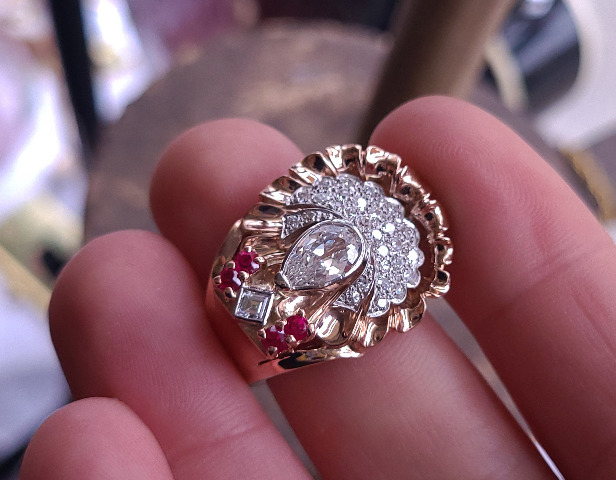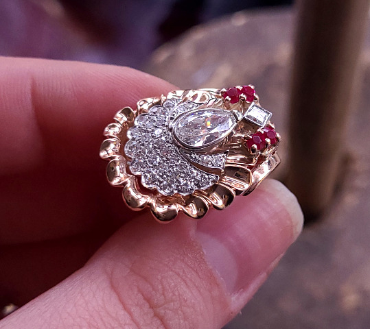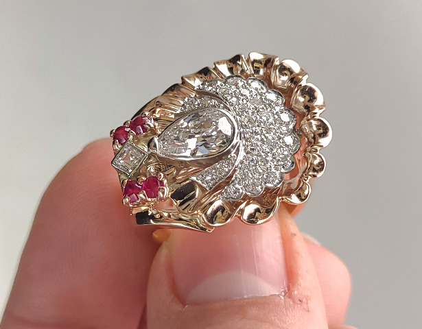 Antique Art Deco 14k Rose Gold 2.6cttw F VS1 Diamond Ruby Open Cullet Stunning Ring sz 8