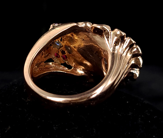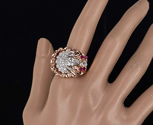 Measurements: Ring size: 8 Ring face length: 1” Diamond stone sizes: 10mm x 6mm x 5mm (1.5ct), 4mm x 4mm x 3mm (.39ct), 1mm x 1mm x 1mm (.008ct each) Ruby stone sizes: 3mm x 3mm x 2mm (.13ct each) Cttw: 2.6ct Weight: 16.2g / 10.4dwt