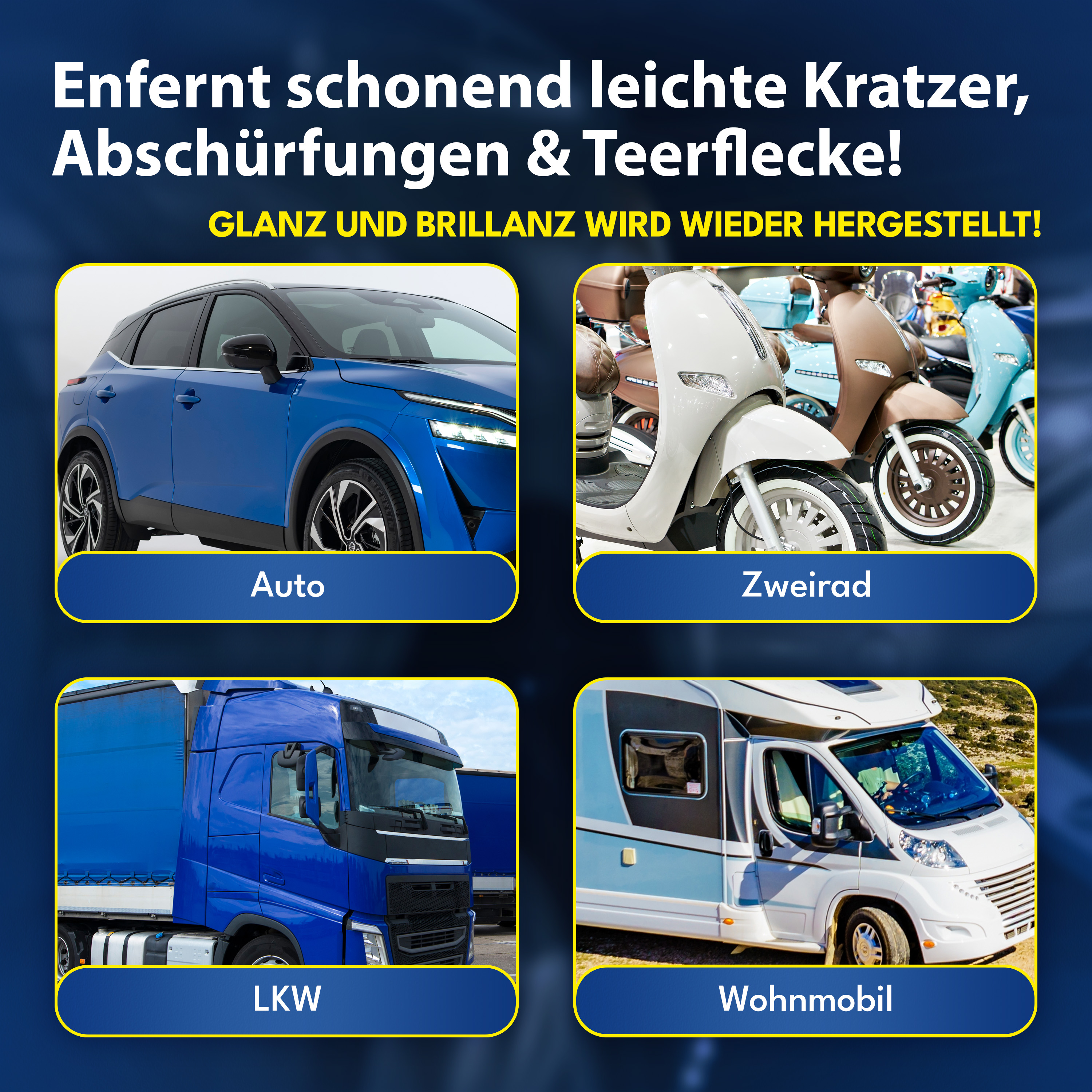 Der ATG Kratzerentferner für Autolack wurde entwickelt, um kleinere leichte Oberflächen-Kratzer (keine tiefen Schnittkratzer) bei Metallic-, Bunt- und 2K-Lackierungen zu entfernen. Diese neue Technologie kann zum Ausgleichen von Lackierungen und auch als Teerentferner verwendet werden.