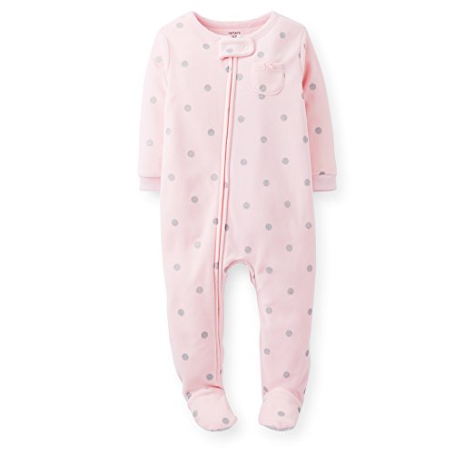 In pink with shimmery silver polka dots.100% PolyesterZips from ankle to chin for easy on and offBuilt-in footies with grippersMicrofleece