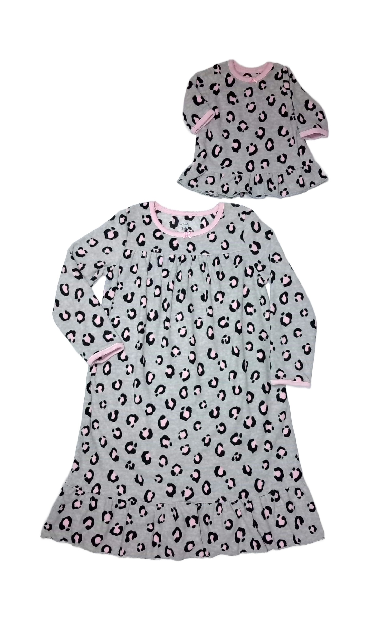 She'll love the supreme comfort of the ultra-soft fleece on this cat print themed nightgown. In gray with a black and pink cheetah print throughout. Light pink rib-knit collar trim with picot stitching and a small pink bow accent. A gathered bodice and hemline. Of an ultra-soft fleece fabric, 100% Polyester