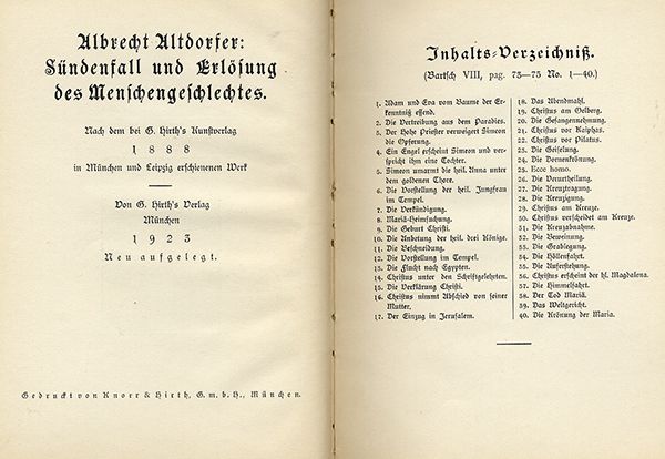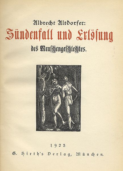 | DEUTSCHLAND RENAISSANCE KUNST UND KULTURGESCHICHTE Albrecht Altdorfer Adam und Eva - Sündenfall und Erlösung des Menschengeschlechtes. Kunstgrafische Buchausgabe Hirth Verlag in München 1923 gesamt 40 Seiten Bildtafeln mit Abbildungen der von Altdorfer gefertigen Holzschnitte Guter Zustand Format 20cm x 16cm. Die ausgewählten Bild Beispiele haben eine unterschiedliche Auflösung was die Wiedergabe durch den Scan beeinträchtigen kann. | |||||||||||||