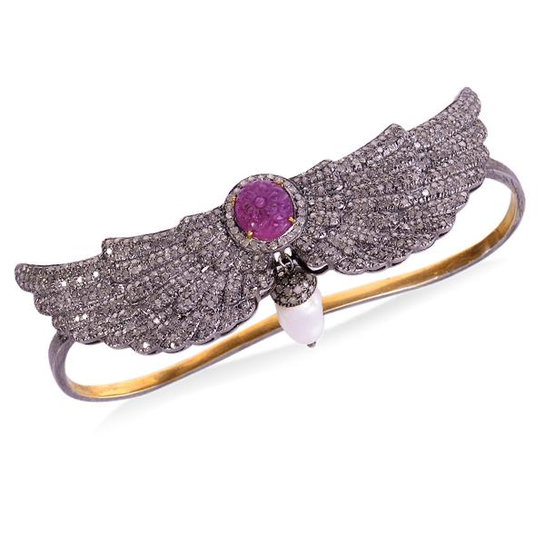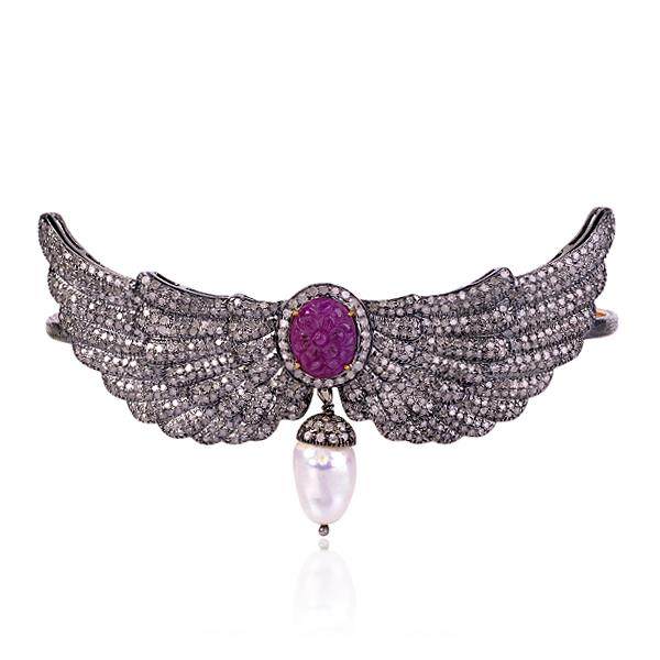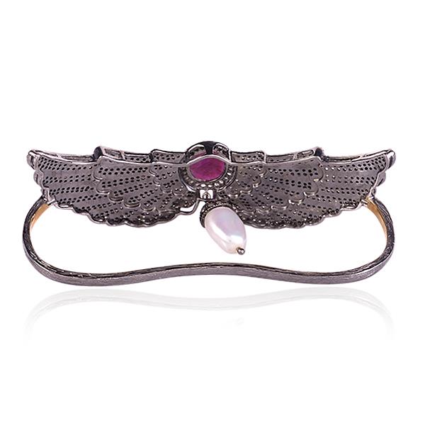 7.65ct Pearl Carved Ruby Diamond Feather Vintage Look Palm Bracelet 925 Silver