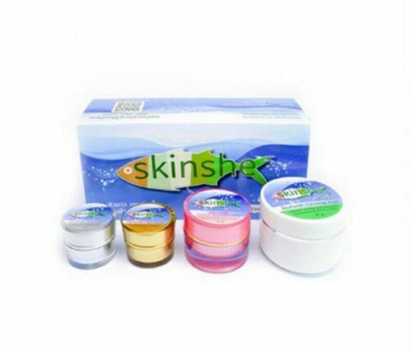 Brand / Line: Skinshe Whitening Cream Set complete four piece skincare regimen for face care. Skinshe Whitening Cream Set is suitable for adults seeking tone correction Set Type: Multi piece gift set including cleansing foam green 40 g, day cream silver 5 g, night cream golden 5 g, intensive moisturizer pink 10 g Skin Concerns: Dark spots, melasma, freckles, post acne marks, uneven tone, dullness Skin Type: All skin types including spot prone and sensitive types with proper patch test Key Functions: Brightening appearance, supportive hydration, smoother texture, comfortable cleanse Country of Origin: Thailand PAO: 12 months after opening UPC / GTIN: 0757445775436