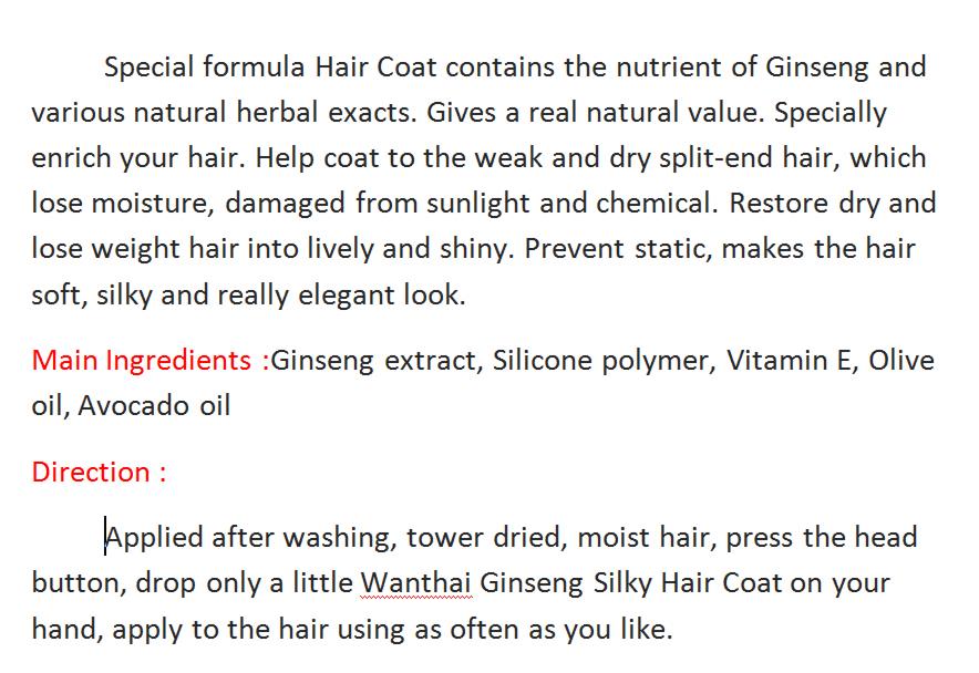 | | | Wanthai Ginseng Silky Hair Coat Vitamin E And Olive Oil For Damaged Hair 20ml. | Shipping Details: - The item will be shipped worldwide next business day after the money has been transferred to my Paypal account and you should received in 2-4 weeks. The item will be posted by airmail from Thailand in well package and send by Non-Registered airmail.
