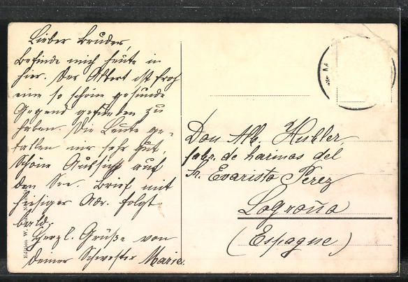 gelaufen, Briefmarke entfernt, rückseitig Oberflächenschaden, Eckknick oben li., Ecken bestoßen, sonst guter Zustand