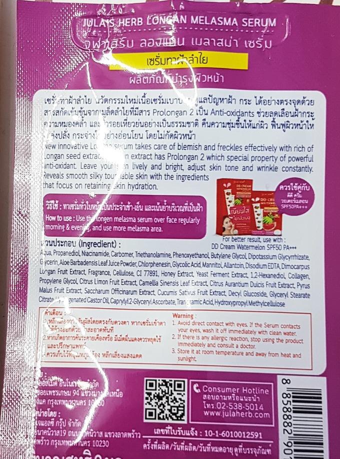 Light texture serum that helps fix the problem of freckles With concentrated extracts from longan seeds That contains important substances, polyphenols, including Gallic Acid and Ellagic Acid, helping to fight free radicals And can help reduce the appearance of freckles and fade Along with the extract of gooseberry that is rich in vitamin C and various minerals that help adjust the dull skin to gradually whiten and clear up And also helps increase moisture to the skin To reduce wrinkles Which is gentle on the face Does not bite the skin and does not cause irritation to dry skin