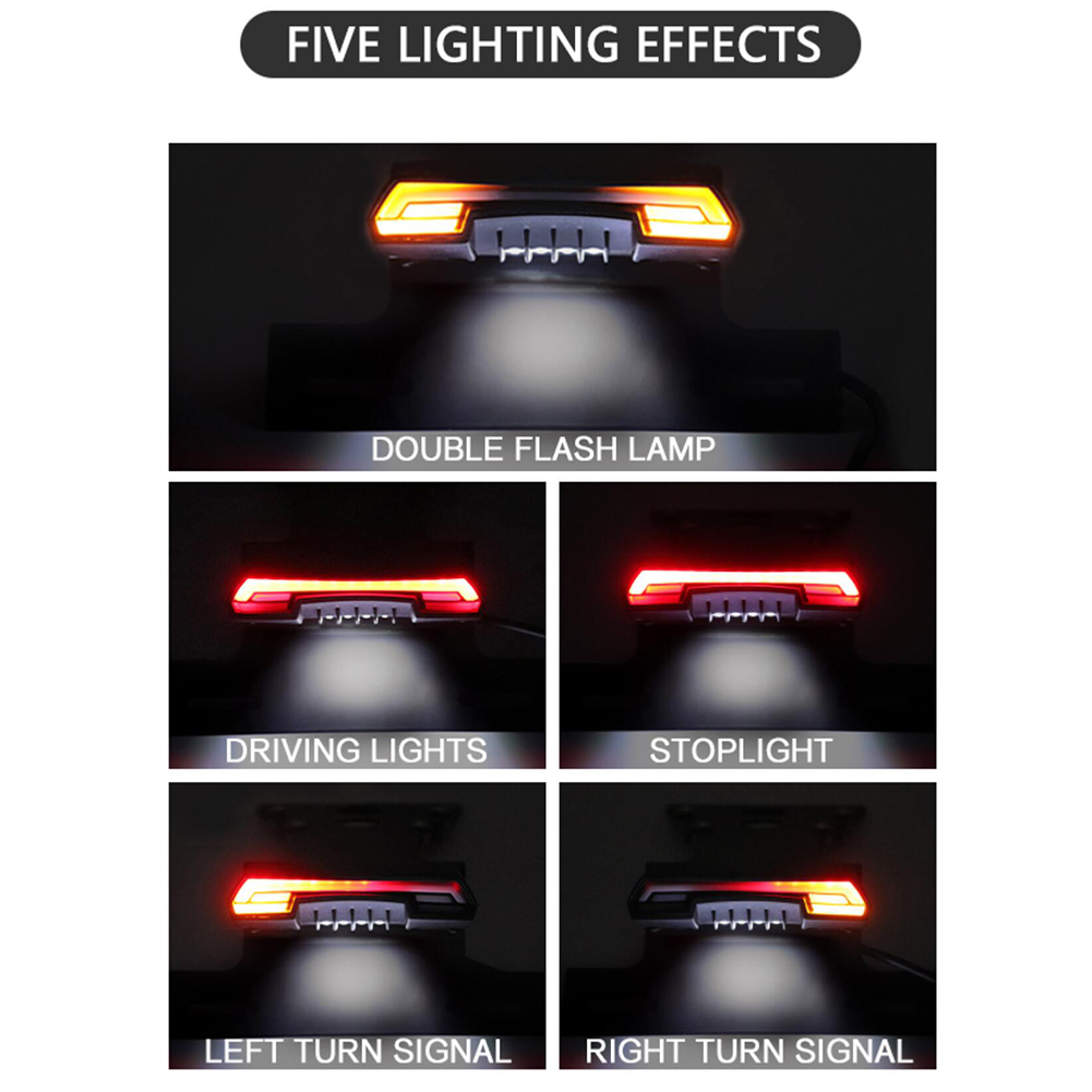 The taillight is a dynamic water lamp and has a waterproof function. It features running lights, brake lights, left steering, right steering, and emergency lights (double flashing lights).