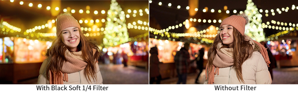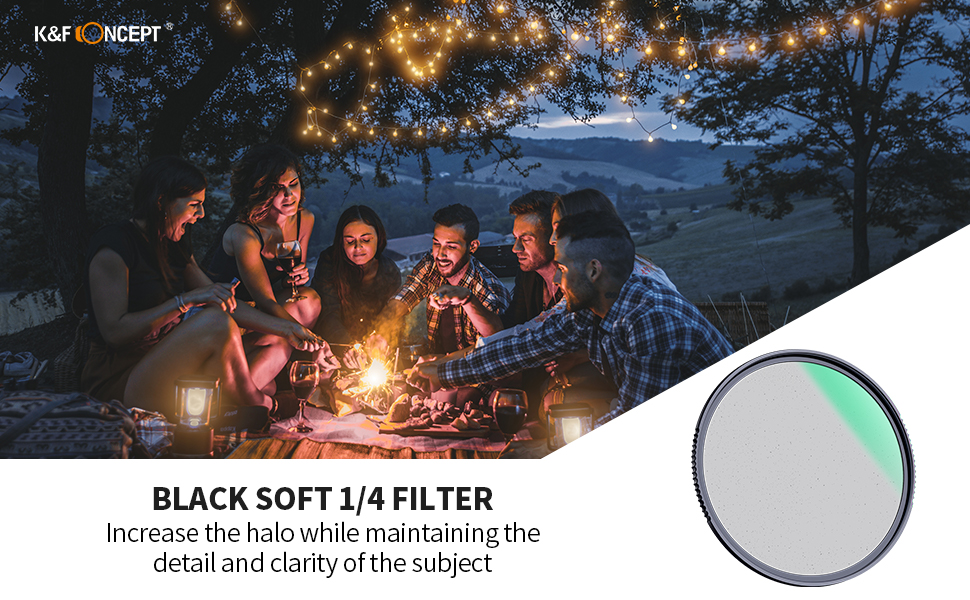 K&F Concept Black Soft 1/4 Special Effect FilterThe K&F Concept black soft special effect filter with its unique multi-layer anti-reflection coating, function effectivly reduced the reflection came from both ground and filter itself, increasing the light transmittance to 84%. Even at its lowest density K&F Concept 1/4 black soft effect filter can soft wrinkle and pores of human skin, it delivers an effective and increase in the halation which adds a pleasing depth of warmth showing the delicate and hazy movie effect in images, but is not transported to the skin tone values. |