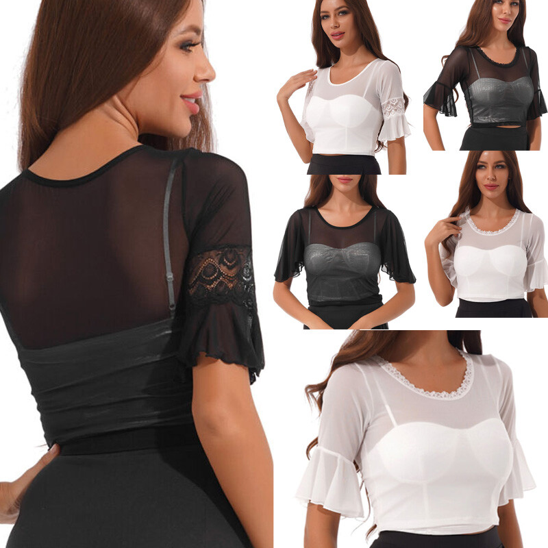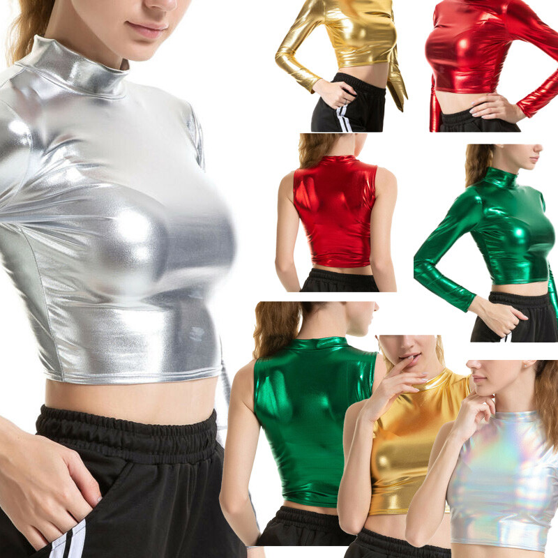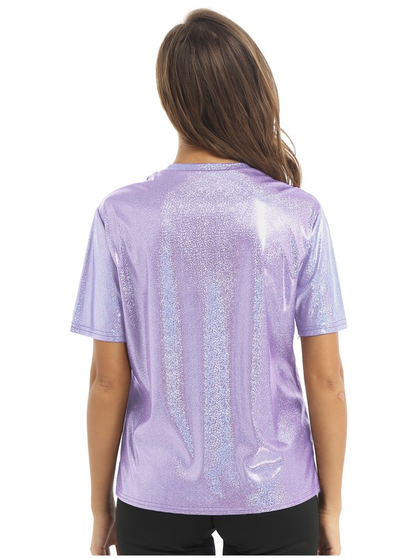 Womens Fashion Shiny Short Sleeve T-Shirt Casual Sparkling Round Neck Tops.