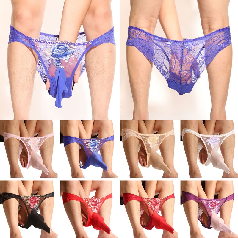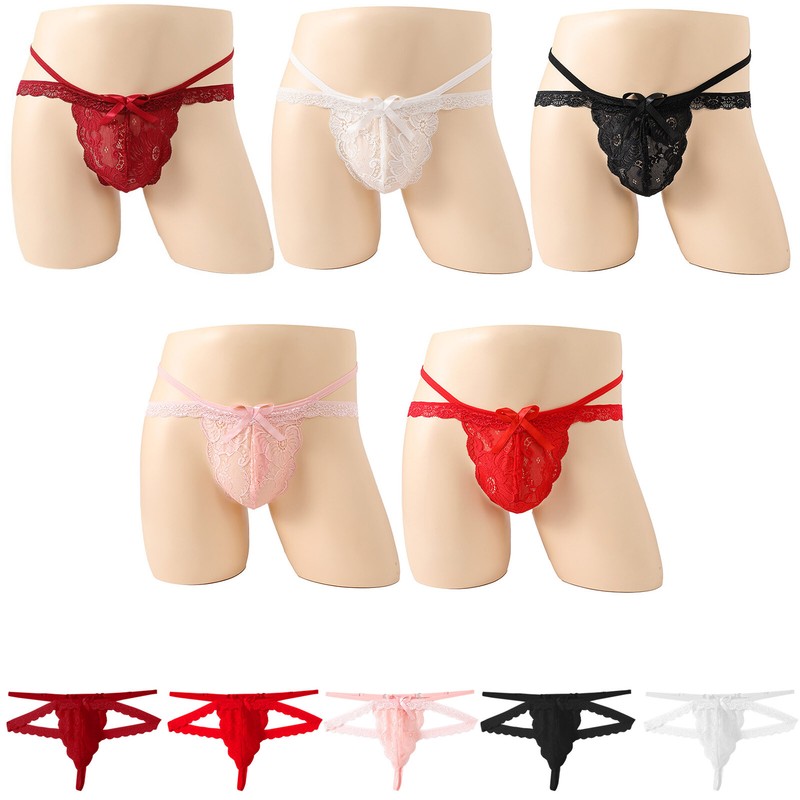 Sexy Men’s thong, strap waistband, T-back style, with mesh and lace flower design.