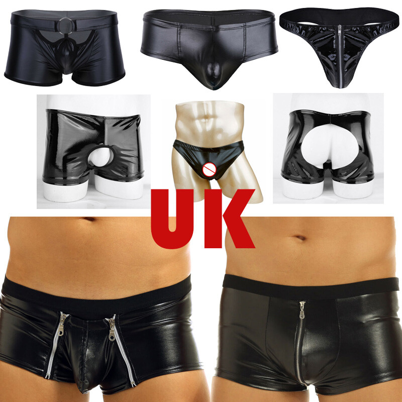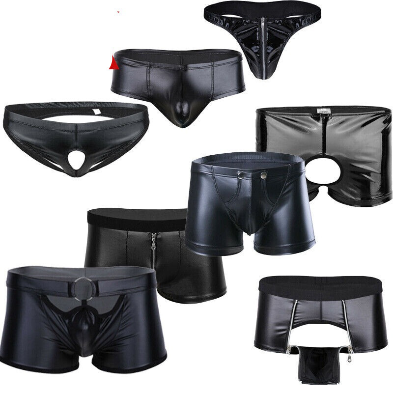 Men’s stretchy short briefs underwear, shiny patent leather design.