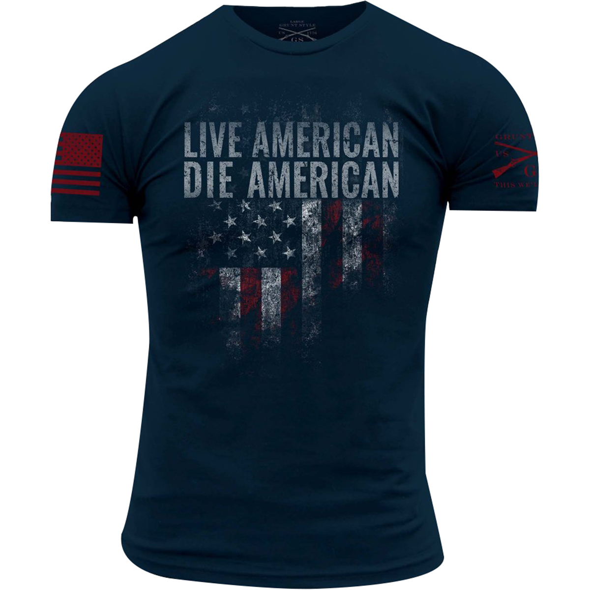 We live American and will die American, and we'll crush anyone or anything that tries to prevent that. This Grunt Style T-Shirt is crafted with 100% cotton for soft, all-day comfort and a tagless, itch-free design. It also has a ribbed collar that won’t lose its shape, and double needle stitching for long-lasting durability. There's no better way to show off your American pride than sporting your favorite shirt from Grunt Style.