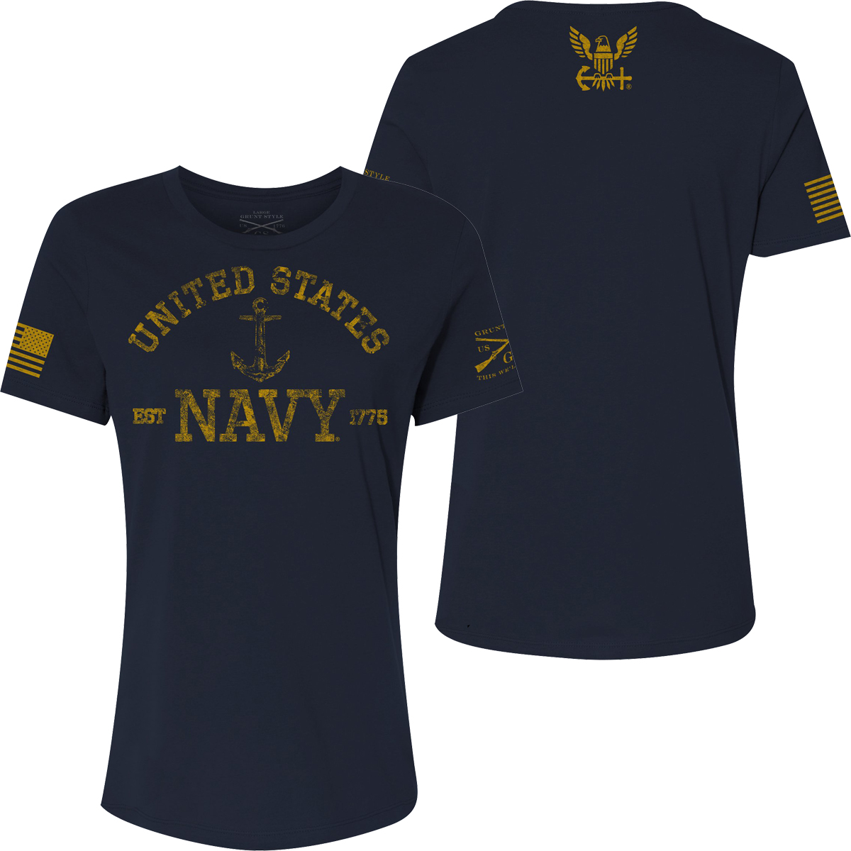The Grunt Style Women's USN - Est. 1775 Relaxed Fit T-Shirt is crafted with combed ring-spun cotton for soft, all-day comfort and wear. It features a tagless, itch-free design and ribbed collar that won't lose its shape. It also has double-needle stitching for durability. There's no better way to show your American pride than sporting your favorite shirt from Grunt Style.