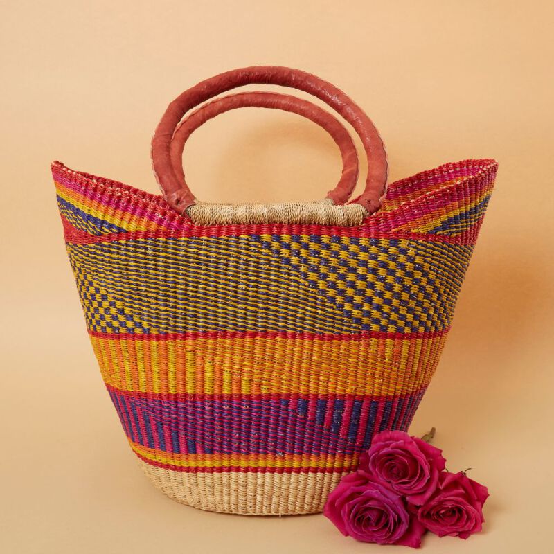 ● Market basket in yellow and orange patterns with leather handles. ● Measures approx 16" length, 10" width, 13" basket height, and 6" handle height ● Use as basket for farmers market, harvesting, gardening, fruit picking, picnic or home decor. ● Hand woven from locally harvested and colorful dyed elephant grass. ● Made in Bolgatanga district of Ghana. Baskets are popular as Bolga baskets or Ghana baskets. ---------------------- Our vibrant colorful baskets are made by a women's artisan co-operative in the Bolgatanga region in Northern Ghana. Artisans weave baskets using Veta Vera grass, a tropical grass grown in Southern Ghana. The grass is harvested, stored, and transported from Southern Ghana to Northern Ghana. Elephant grass is dyed, dried, twined, and woven into a basket. Grass staws are carefully selected by the weaver before weaving. It takes 3 days to weave a medium size basket. These baskets are exclusively woven in the Bolgatanga region in Northern Ghana. Basket weaving is a major contributor to the Bolgatanga economy. Around 22% of their population is involved in weaving baskets.