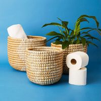 *Set of three nesting grass baskets. * Large - 13" diameter, 11" height. * Medium - 11" diameter, 10" height. * Small - 10" diameter, 9" height. * Natural, white and yellow color. * Showcases geometric pattern. * Handwoven from kaisa grass and plastic ribbons. * Kaisa grass is a sturdy local wild grass. * Sustainably produced. * Made in Dhaka, Bangladesh. --------------------------------- Bangladesh is known for handcrafted baskets. Artisans use locally available grasses, fibers, and leaves such as hogla, kaisa, jute, and palm leaves to make sturdy baskets. Grasses are cut green and dried to a tan color before they are woven into baskets. All materials used for weaving are cut such that they grow back every season and thus making them a sustainable source. Some baskets are also woven with cotton fabric and leather to create unique details. Baskets are woven mostly by women. Women weave baskets at the convenience of their homes. This allows them to run households and earn income for their family.