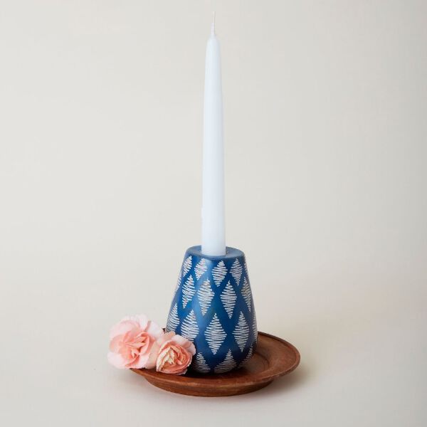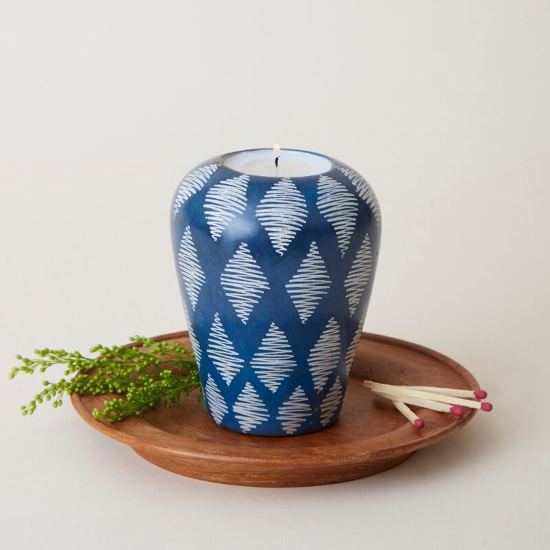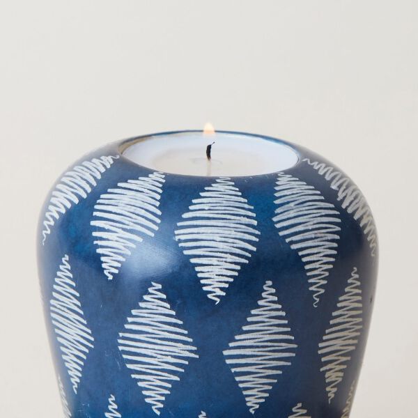 * Tealight and taper candle holder in teal color soapstone. * Etched stripes pattern on the candle holder. * Tealight cup on one side and taper candle cup on the reverse side. * Candles not included. * Measures 3" length, 3" width, and 3.5" height. * Smooth sanded finish. * Carved from soapstone mined in South West Kenya. * Handmade by Kisii tribe artisans in Kenya. --------------------------------- Soapstone is a natural rock and each stone has varying patterns. Soapstone is relatively soft because of its high talc content. It has a smooth finish and feels like soap, hence the name. The soapstone for our products is mined from the Tabaka Hills in Kisii County of South Western Kenya. The carvers are people from the Kisii tribe and they call the soapstone locally as Kisii stone. The men in the community primarily do the mining of soapstone. Using simple tools like shovels and hammers, they extract the stone for carving. Once the stones are carved to desired shapes, it is passed to the women members to sand each figure and produce smooth even finishes.