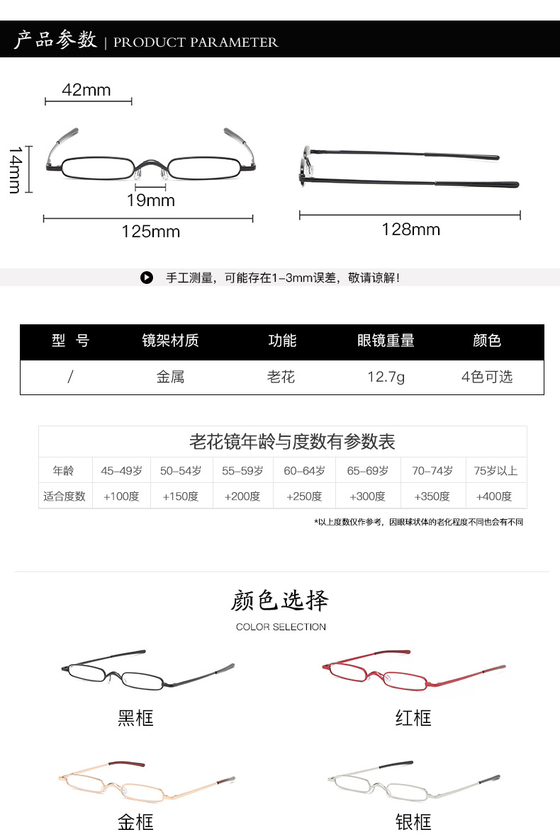 Package: 1x reading glasses Note: Please allow 1-2 cm measurement error due to the manual measuring way. The